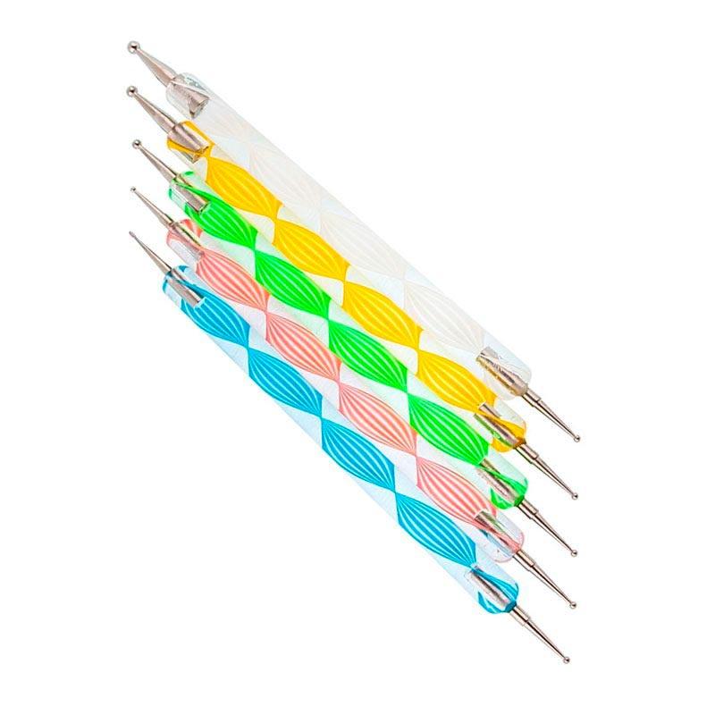 ДОТС з подвійними наконечниками різного діаметру. Дотс - це саме той інструмент, який стане незамінним помічником для створення всіляких малюнків на нігтях. За допомогою Дотса легко створювати різноманітні завитки, пелюстки квітів, точкові візерунки, при його допомоги дуже легко викладати посмішку для різноманітних видів френча. Їм дуже легко працювати по які застиглому матеріалу, такого як гель або акрил. Також ДОТС стане незамінним при виконанні дрібних робіт, таких як дизайн нігтів з використанням бульонок, страз, каменів Swarovski, адже з його допомогою ви завжди зможете без проблем зачепити дрібні деталі. Дотс дуже легко тримати в руках, адже він затискається як звичайна ручкадля листи, або олівець для малювання.