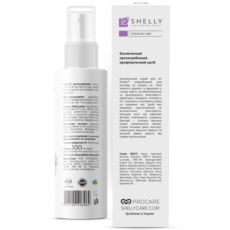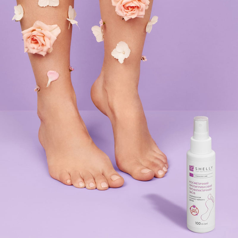 Косметичний спрей для ніг Shelly розроблений для догляду за шкірою ніг. Олія чайного дерева і фарнезол у складі мають антибактеріальні та дезодоруючі властивості, ефективно знижують пітливість ніг, тонізують і освіжають шкіру на тривалий час. Засіб має виражені протигрибкові та антисептичні властивості, захищає ноги від інфекцій. Активні компоненти усувають бактерії – головну причину появи неприємного запаху. Спрей починає діяти миттєво, гарантуючи відчуття свіжості та високий рівень захисту від грибка протягом дня.