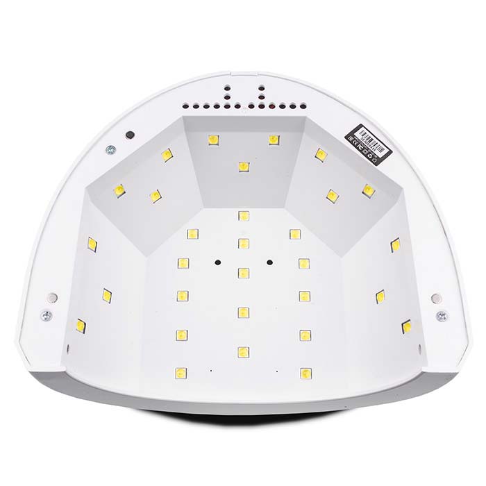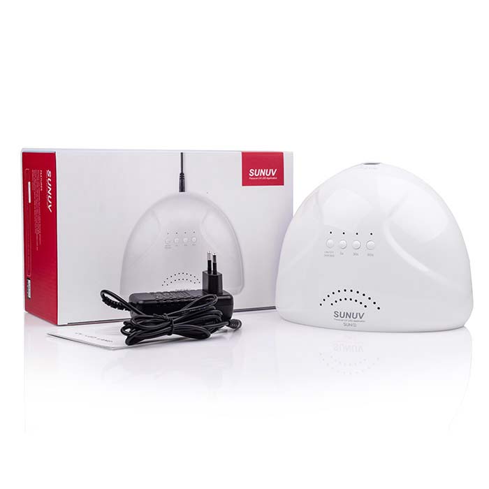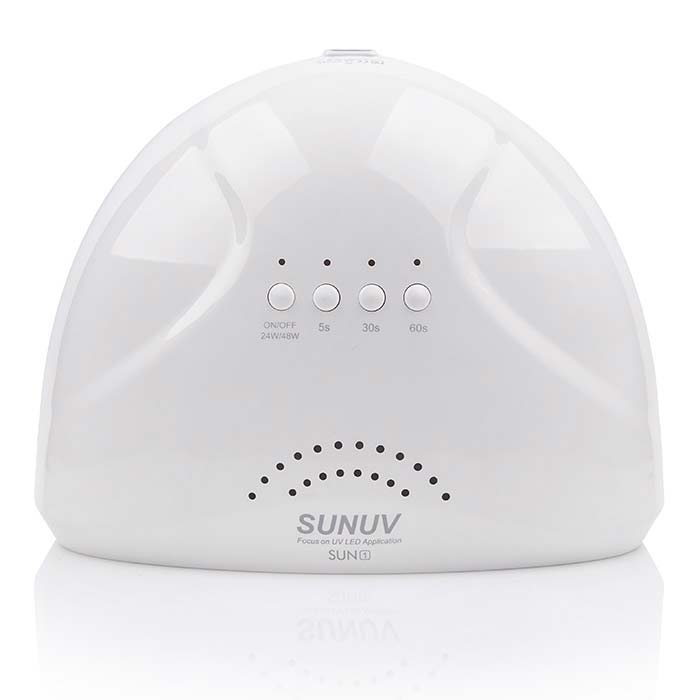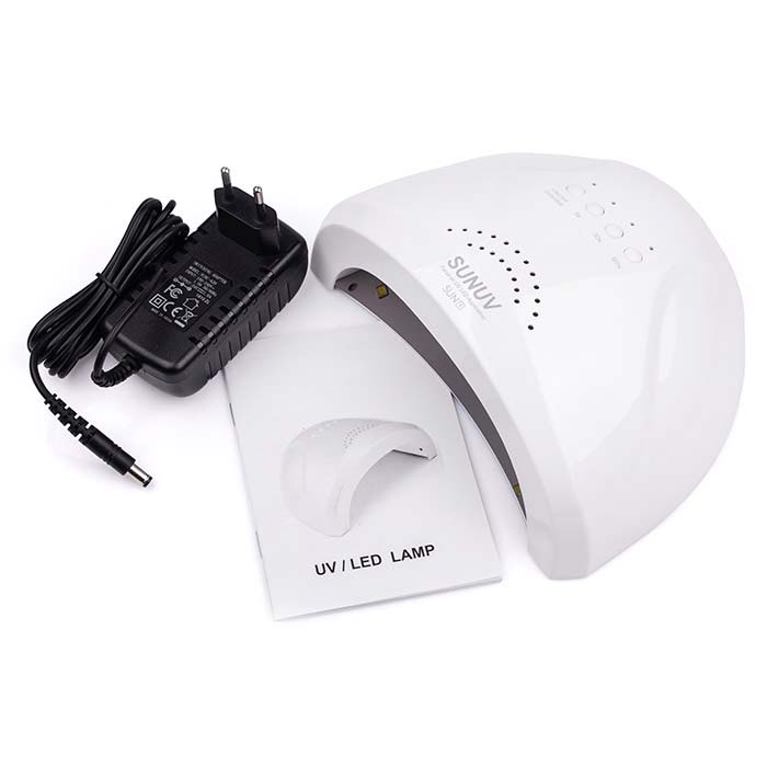 Универсальная LED+UV SUN 1 WHITE 48W Original с технологией двойного источника света, охватывает более широкий спектр ультрафиолетового диапазона, по этому подходит для сушки гель-лаков и большинства гелей, оснащена 30 светодиодными лампочками. Имеет пластиковый корпус, на верхней части которого расположена кнопка для вкл/выкл, так же удерживая данную кнопку в течение 2 секунд можно переключить мощность лампы с 24 Вт на 48 Вт. Лампа может работать в двух режимах: с таймером на 5, 30 или 60 секунд, или в режиме бесконечности 120 сек., который активируется сенсором движения до тех пор пока рука находится в лампе. Имеет съемное дно, что удобно при педикюре.