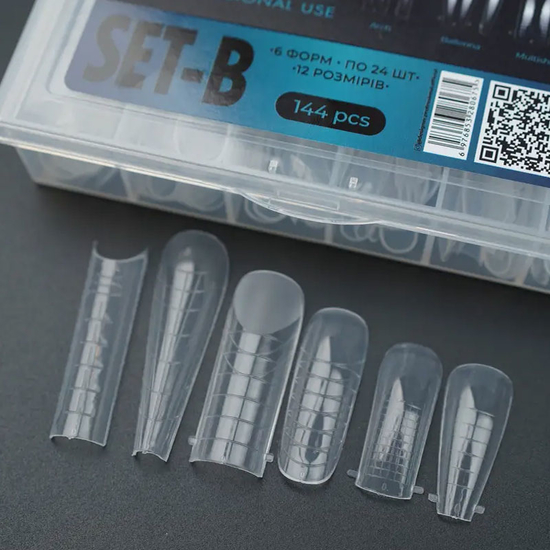 В упаковке представлены 6 видов форм в 12 размерах по 2 шт. каждого размера для оптимального подбора в зависимости от особенностей натуральных ногтей и ногтевого ложа.