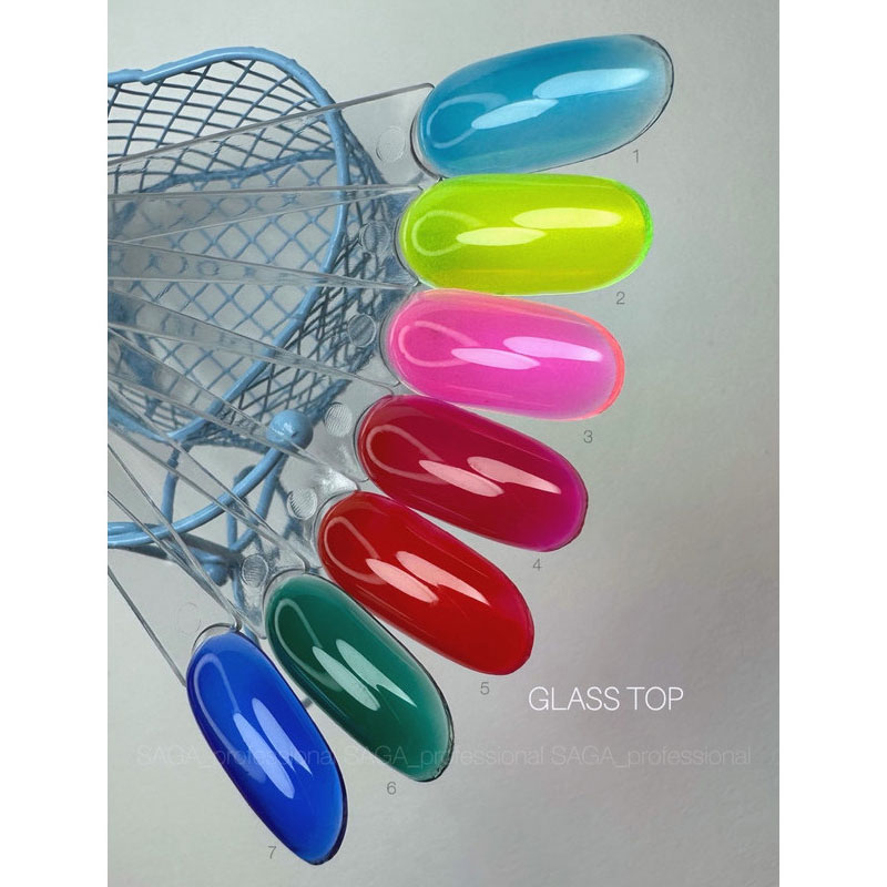 Saga Glass Top наносится после подготовки ногтевой пластины (гигиенический маникюр, опилки, обезжиривание), нанесение базы и гель-лака. Далее сушится в лампе LED (время варьируется в зависимости от мощности прибора). При необходимости можно добавить дополнительный слой топа.